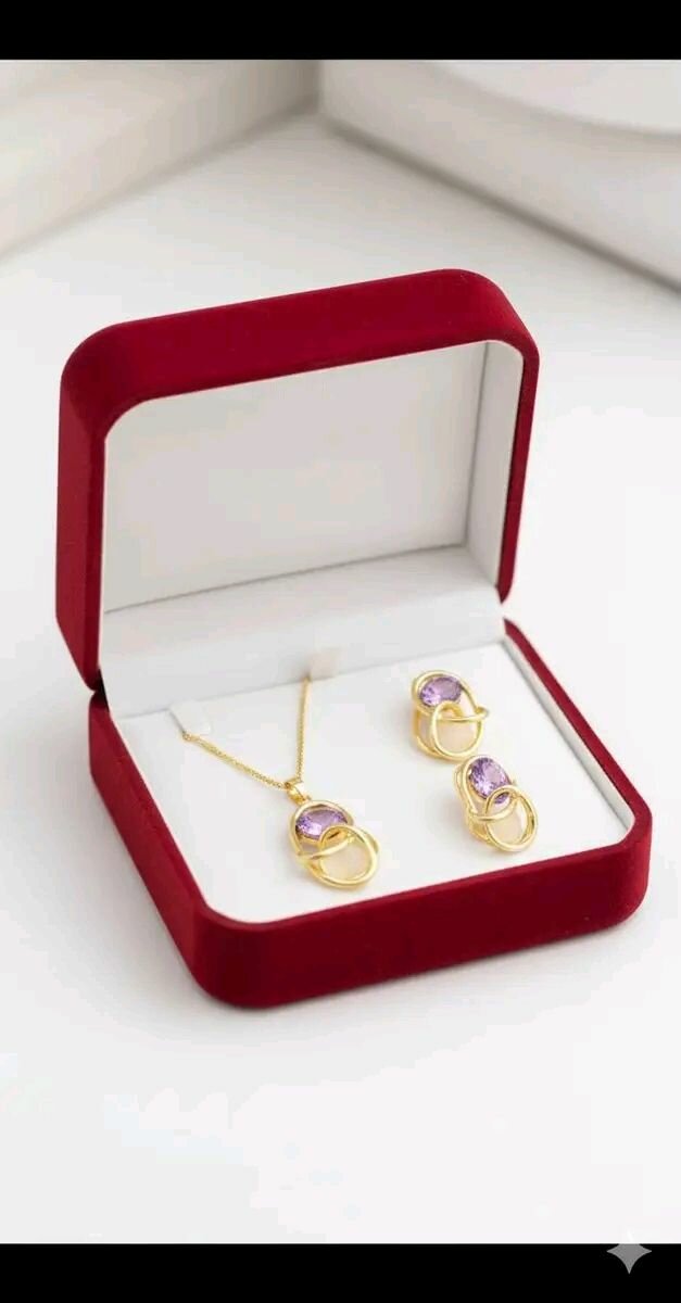 Ensemble élégant de collier et boucles d'oreilles en or avec pierre violette. Parfait pour les occasions spéciales ou comme cadeau. Design moderne et raffiné.