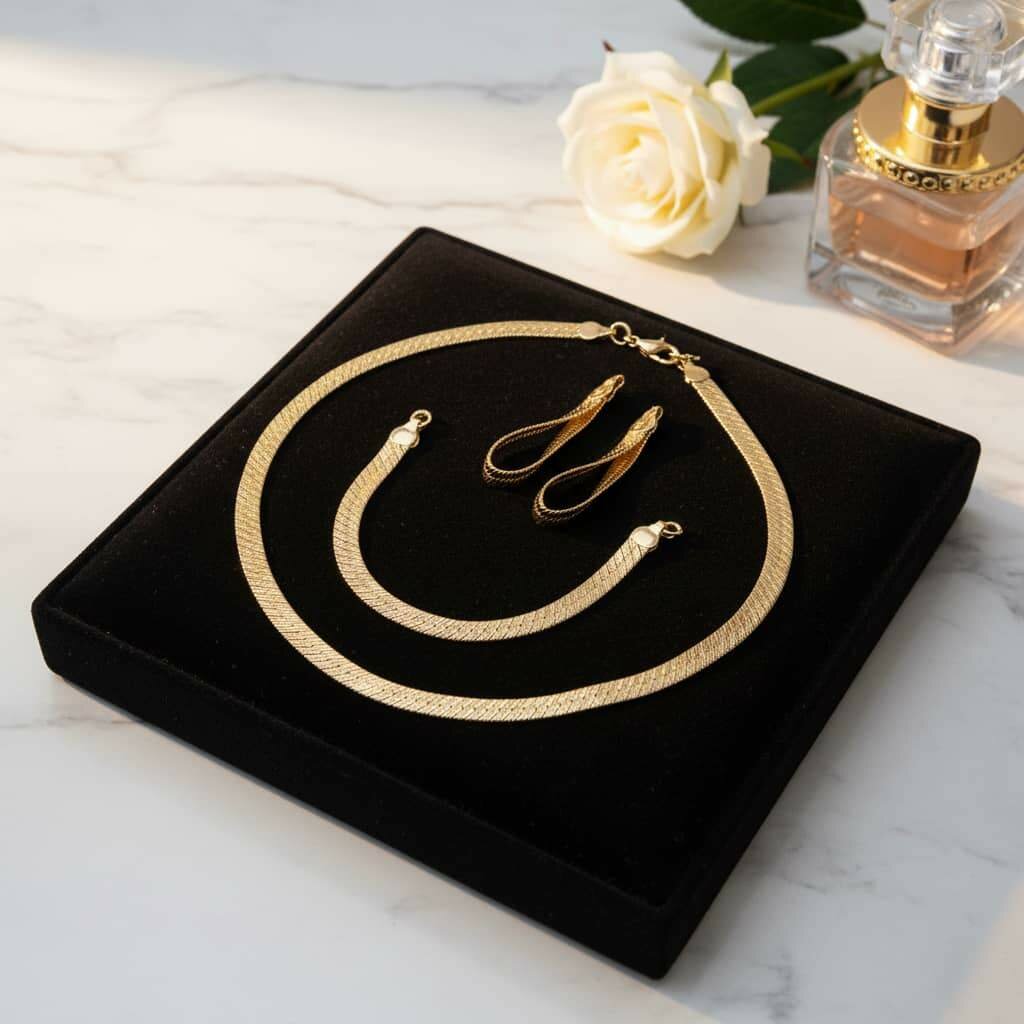 Ensemble élégant de collier et boucles d'oreilles en plaqué or, parfait pour les occasions spéciales. Design raffiné et moderne.