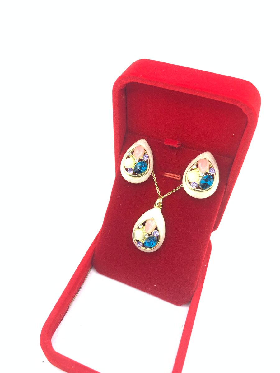 Élégant ensemble de boucles d'oreilles et pendentif ornés de pierres bleues. Parfait pour les occasions spéciales, ce parure est conçue pour illuminer votre tenue.