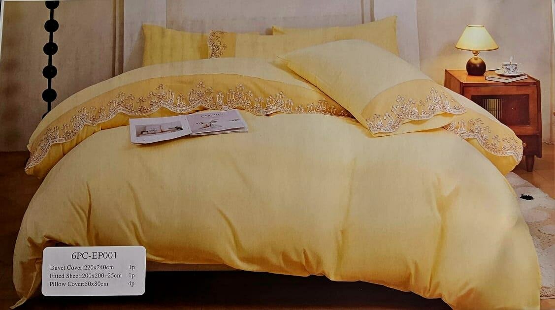 Parure de lit jaune 6 pièces en coton avec dentelle