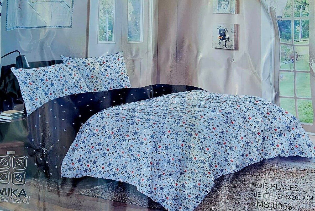Redécouvrez le confort avec cette parure de lit trois places en motif étoilé. Fabriquée pour offrir douceur et style à votre espace, elle convient parfaitement à une chambre moderne. Inclut une housse de couette et des taies d’oreiller assorties. Idéale pour les amateurs d’étoiles.