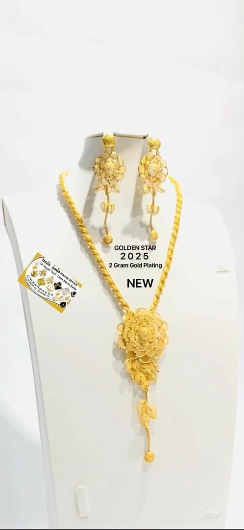 Découvrez l'élégance intemporelle avec cette parure dorée plaquée or de 2 grammes. Incluant un collier exquis et des boucles d'oreilles assorties, ce set est parfait pour sublimer vos tenues de soirée ou vos moments spéciaux. Design raffiné pour une allure chic.