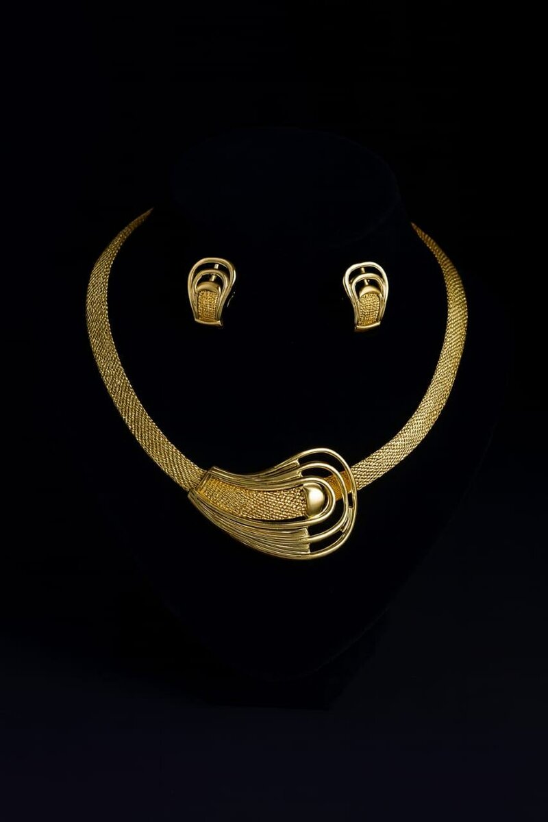 Éblouissante parure en or comprenant un collier et des boucles d'oreilles assorties. Parfait pour sublimer vos tenues lors d'événements spéciaux ou comme cadeau précieux. Son design unique et ses finitions soignées ajoutent une touche de luxe et d'élégance à votre style.