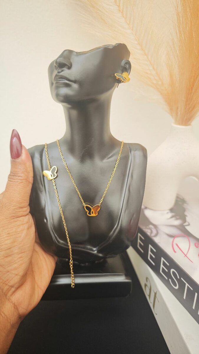 Ajoutez une touche de sophistication avec ce magnifique ensemble papillon doré. Parfait pour les occasions spéciales, cet ensemble comprend un collier et des boucles d'oreilles assortis, mettant en valeur un design élégant et intemporel. Idéal pour sublimer n'importe quelle tenue, cette parure est un choix parfait pour les amateurs de bijoux raffinés.
