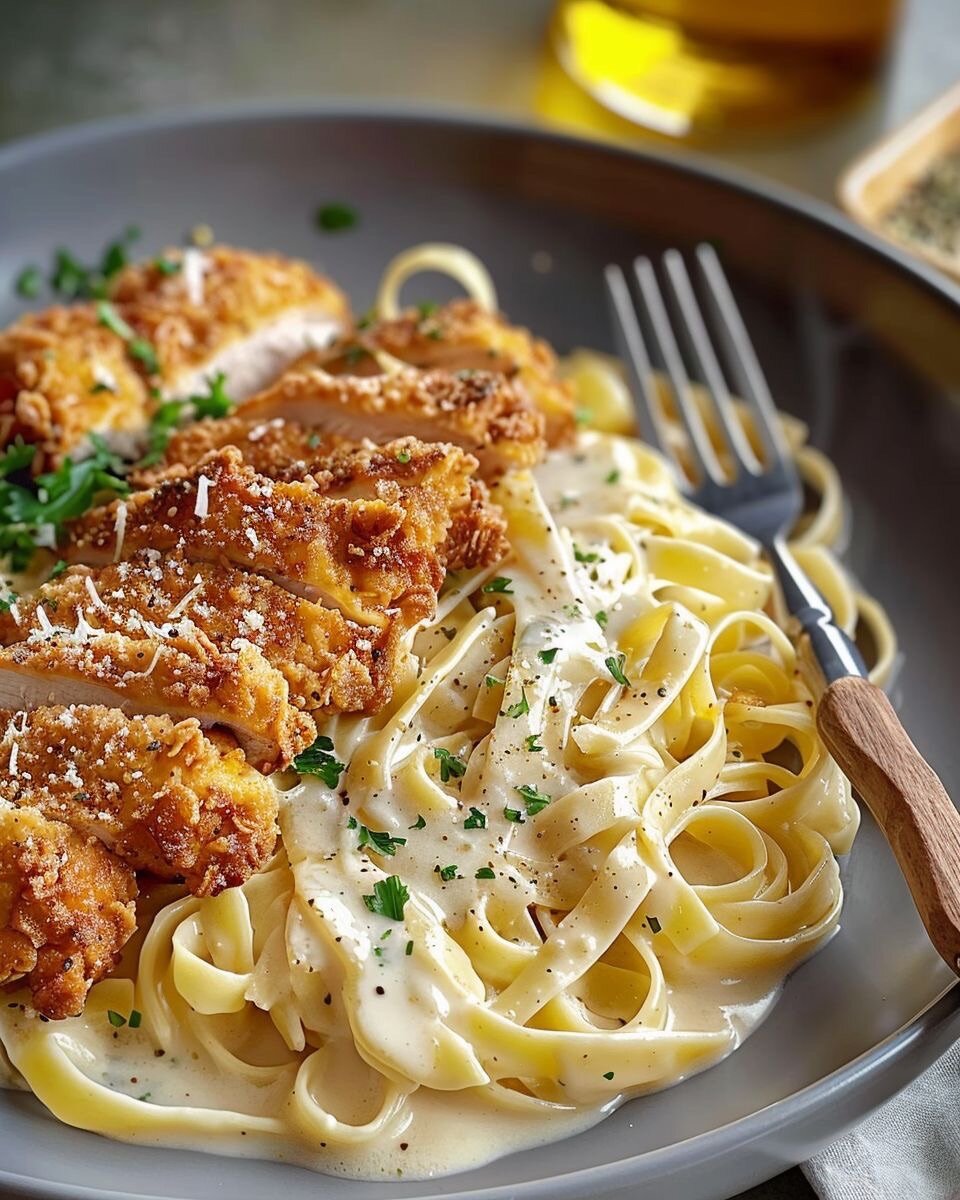 Savourez nos pâtes crémeuses fettuccine accompagnées de poulet croustillant doré à la perfection. Un plat gourmand et réconfortant, idéal pour un dîner en famille ou entre amis. Plongez dans une sauce onctueuse et savoureuse, parfaite pour les amateurs de cuisine italienne.