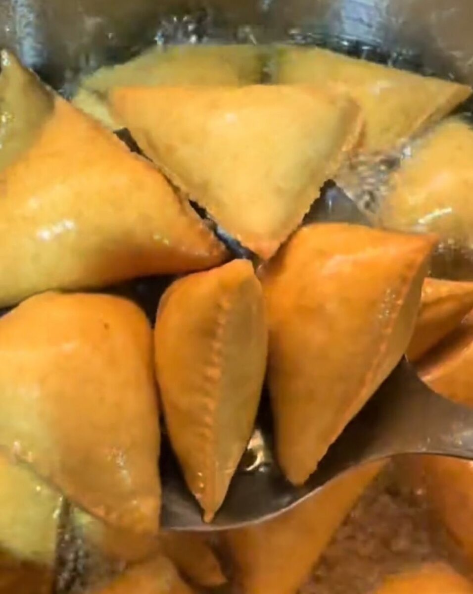 Pastel croustillant en forme de triangle fourré à la viande et au légumes .