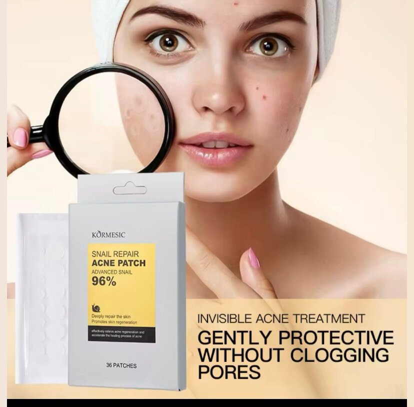 Patch anti-acné à l'escargot, 96% d'extrait pur, répare la peau efficacement. Idéal pour un traitement invisible qui protège sans obstruer les pores. Parfait pour une peau éclatante sans imperfections.