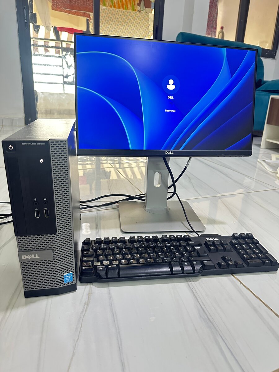Ensemble Dell avec unité centrale, écran, clavier et souris. Idéal pour bureau ou maison, offrant performance et style.