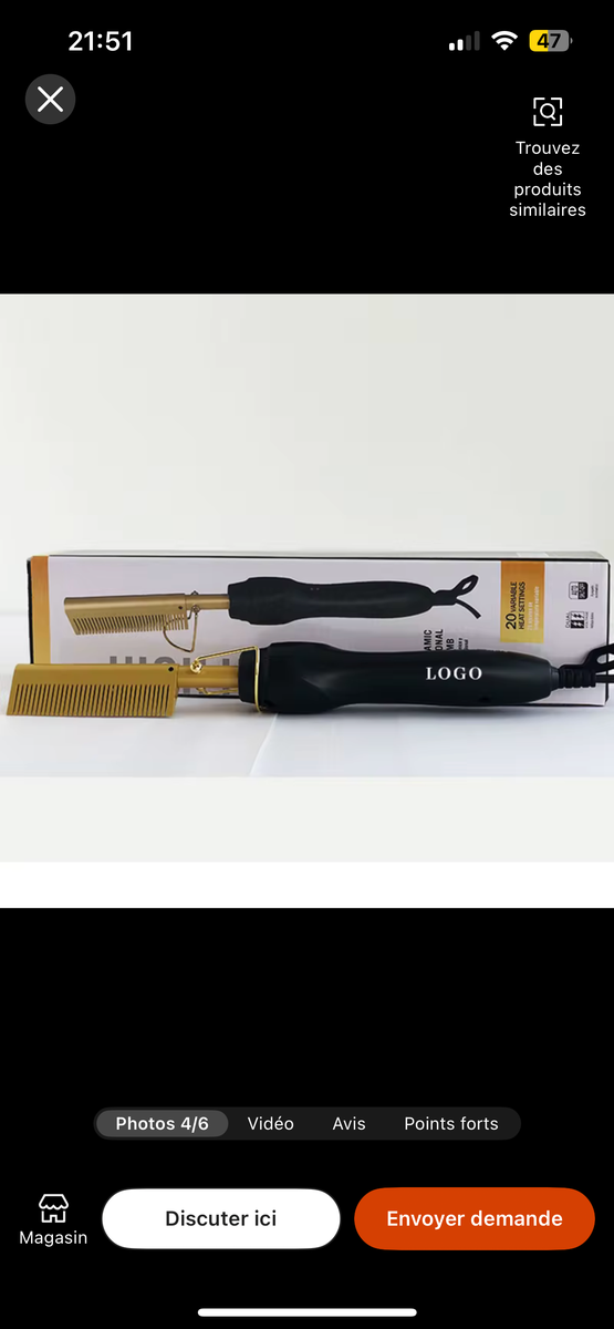 Découvrez notre peigne chauffant professionnel, idéal pour un lissage parfait et rapide. Adapté à tous types de cheveux, cet outil vous garantit un coiffage impeccable. Facile à utiliser, il devient vite indispensable dans votre routine beauté. Parfait pour un usage quotidien ou professionnel.