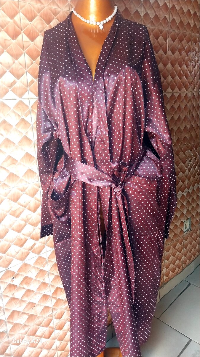 Découvrez le confort et l'élégance de ce peignoir en satin avec motifs à pois. Idéal pour commencer la journée en douceur ou pour se relaxer le soir. Confectionné avec un tissu doux et léger, il est parfait pour toutes les saisons. Portez-le chez vous pour un look raffiné et confortable.