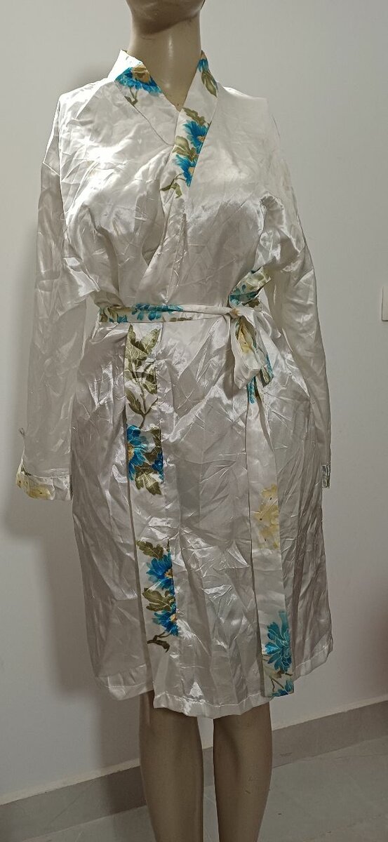 Peignoir élégant en satin blanc avec motifs floraux bleus. Idéal pour les matins décontractés ou les soirées cocooning. Doux et confortable, il deviendra vite un incontournable de votre garde-robe.