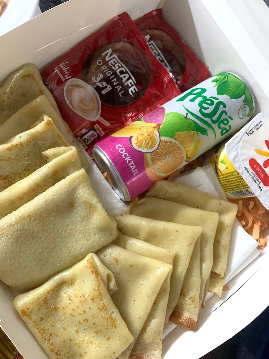 Profitez d'un délicieux petit-déjeuner composé de crêpes moelleuses, café instantané et jus de fruit frais. Parfait pour bien démarrer la journée!