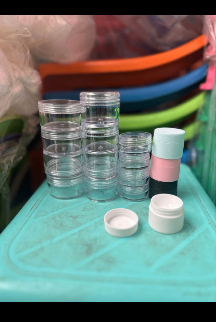 Pots en plastique transparents avec couvercles, idéals pour le stockage de cosmétiques, crèmes, échantillons. Réutilisables et durables. Disponibles en différentes tailles.