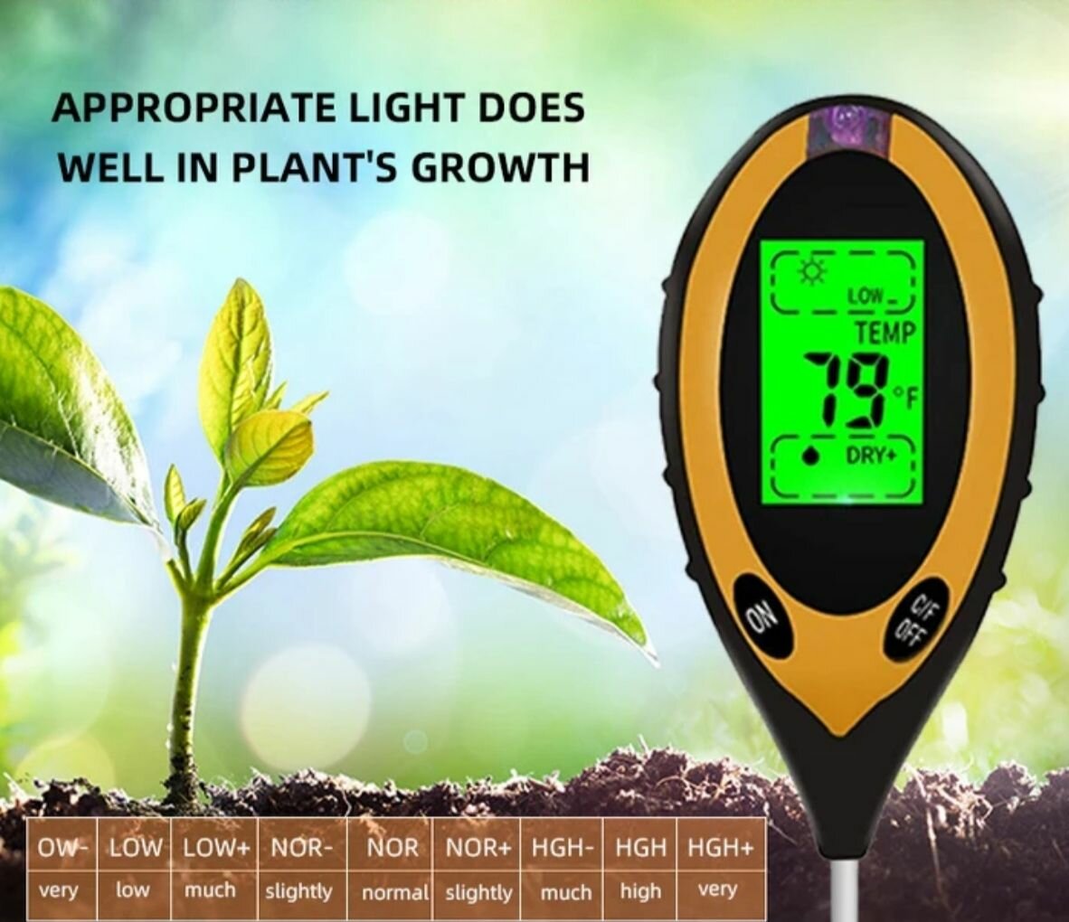 Optimisez la croissance de vos plantes avec cet instrument 4-en-1 qui mesure le pH du sol, l'humidité, l'intensité lumineuse et la température. Idéal pour jardiniers passionnés et professionnels!