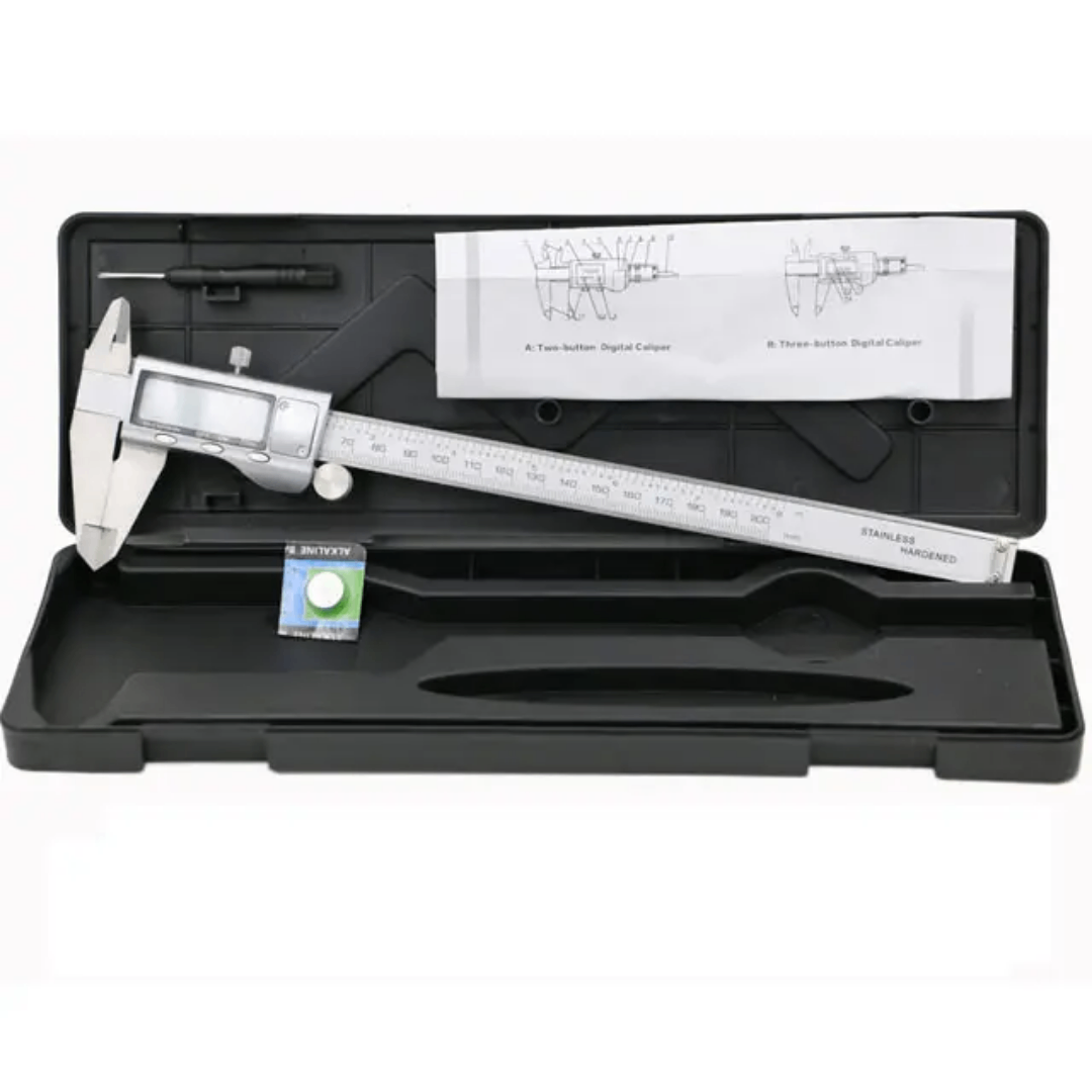 pied à coulisse numérique en aluminium , utilisé pour mesurer avec précision des objets. Il est équipé d'un affichage numérique, ce qui facilite la lecture des mesures par rapport aux modèles classiques à vernier. Ce modèle mesure jusqu'à 200 mm, avec une haute précision. Il est livré dans un boîtier de rangement rigide, accompagné d'une batterie et d'un manuel d'utilisation.