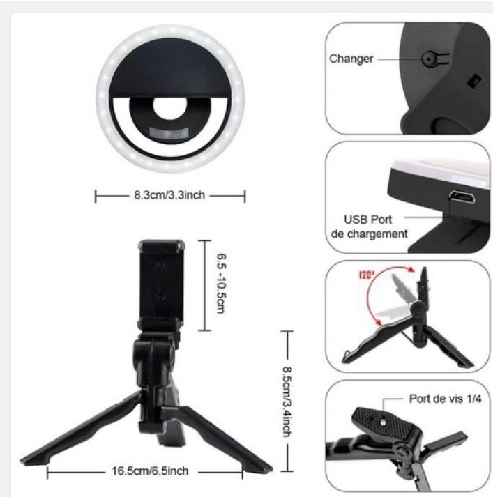 Pince support avec anneau lumineux LED pour téléphone. Idéal pour les vidéos et selfies, il se fixe facilement sur divers supports. Inclut un port USB pour la recharge et une rotation à 120° pour un éclairage optimal et polyvalent. Parfait pour les créateurs de contenu et les vidéoconférences.