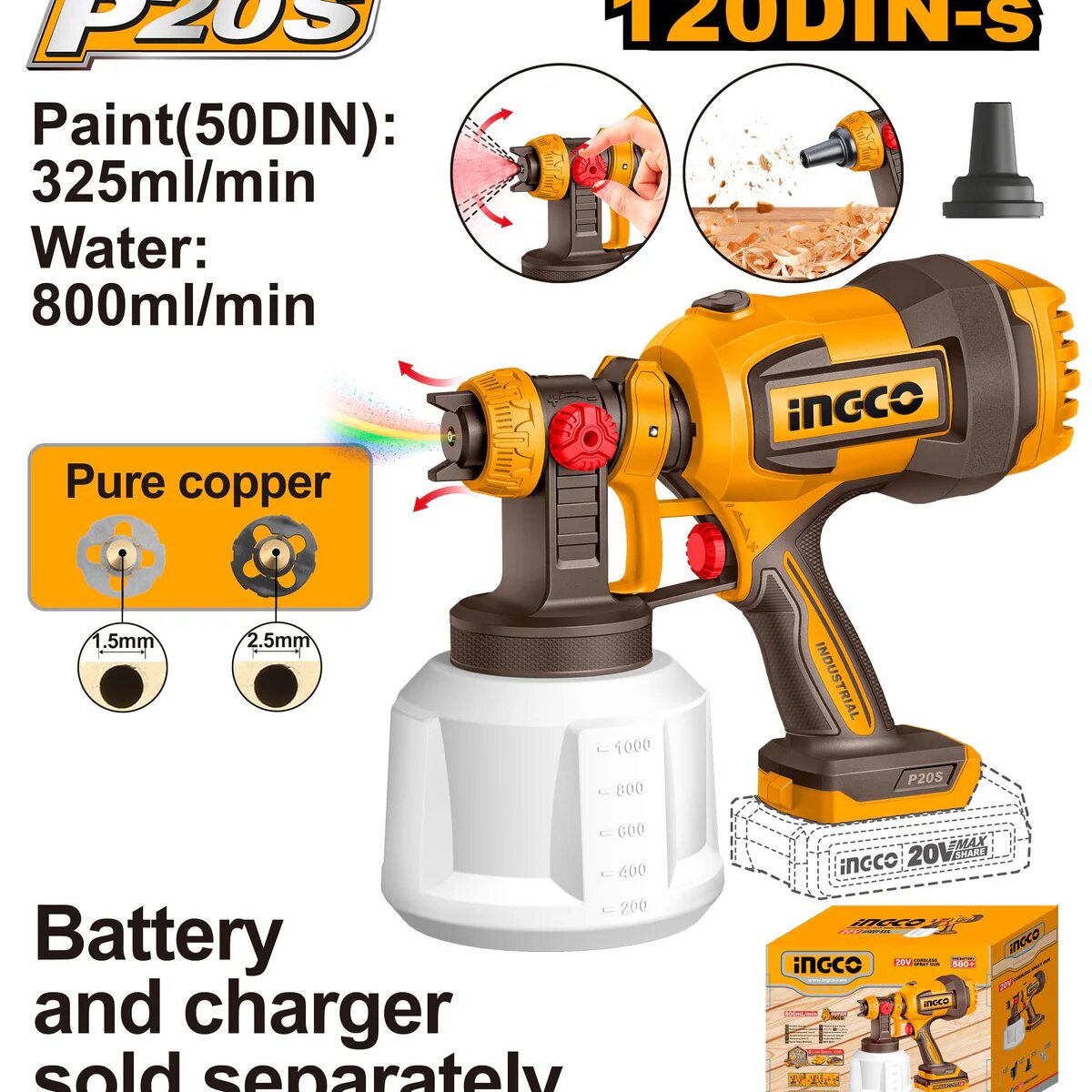 Découvrez le pistolet à peinture sans fil Ingco, l'outil idéal pour vos projets de peinture. Avec un débit de 800 ml/min, il vous assure une couverture rapide et uniforme. Conçu avec du cuivre pur pour une durabilité optimale, il fonctionne avec une batterie 20V (non incluse). Parfait pour une utilisation professionnelle et domestique. Rechargez facilement et profitez d'un outil léger et maniable pour tous vos travaux de peinture.