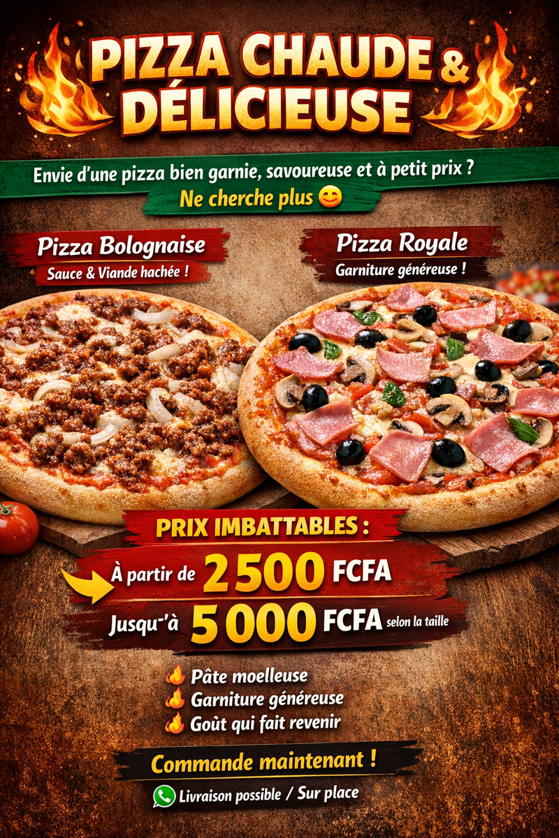Savourez nos pizzas chaudes et délicieuses, préparées avec des ingrédients frais. Deux variétés au choix : Bolognaise et Royale. Commandez maintenant et profitez de notre service de livraison !