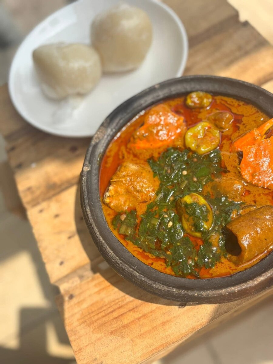 placali et sa sauce accompagné de viande de bœuf ; poisson et crabes