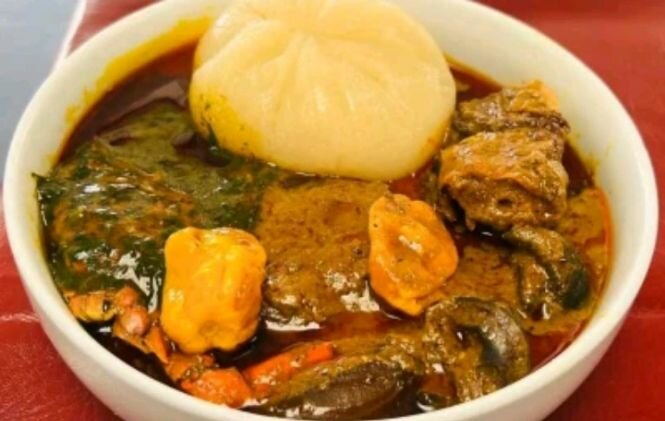 Fred rest'o vous propose ce plat authentique composé de placali accompagné d'une sauce graine avec du poisson fumé kpolo trippe riche en saveurs.