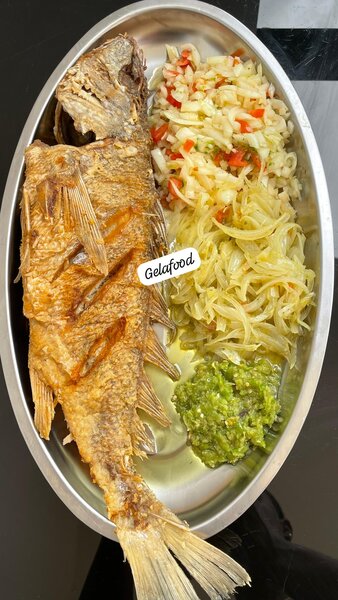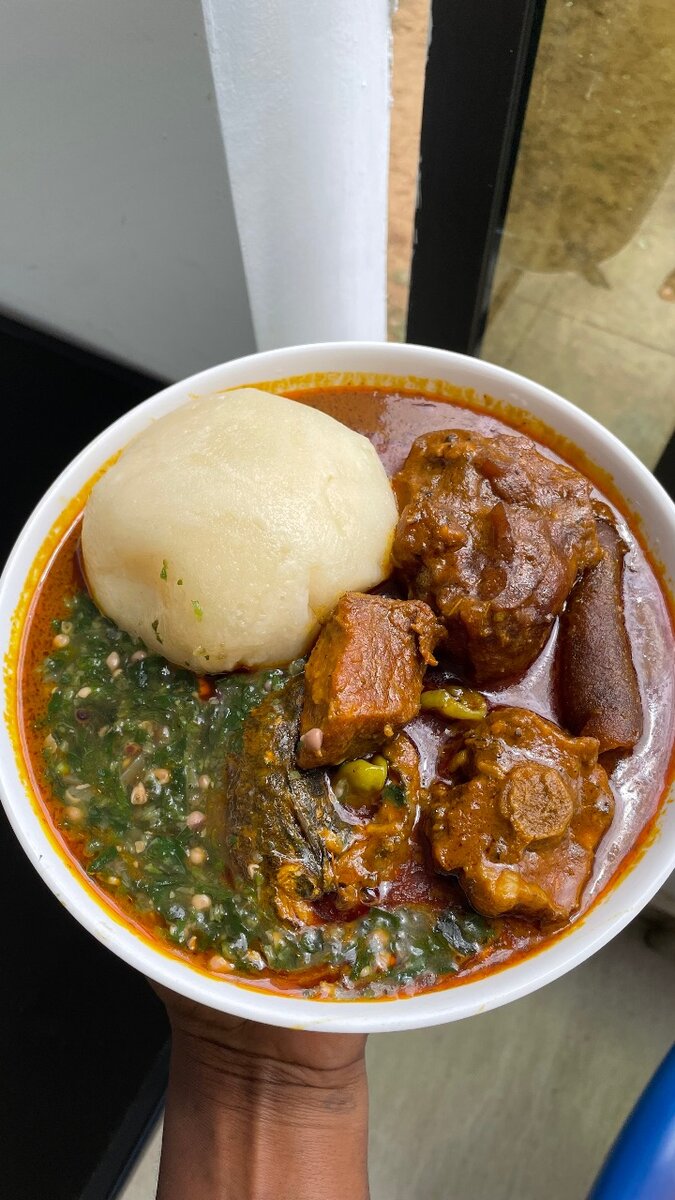 Placali sauce graine accompagné de kplala ( poisson , (crabe ou kplo ) patte de bœuf )