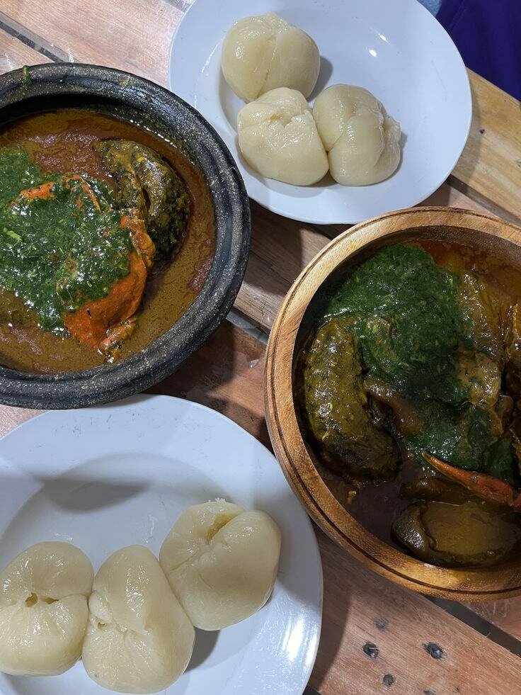 Placalie sauce graine mélangé gombo et pklalala Accompagné de peau de bœuf poisson triple de et crabe