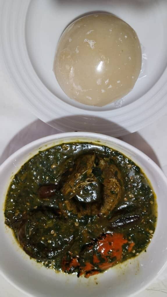Placali avec sauce kôpê, kplala au viandes de bœuf, porc, et crabes