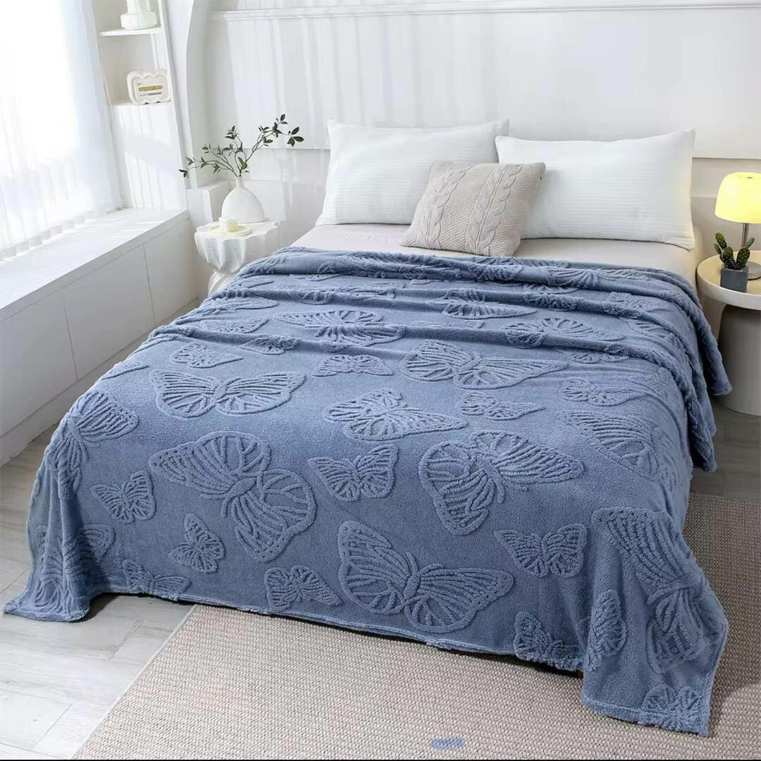 Ajoutez une touche d'élégance à votre chambre avec ce plaid doux et moelleux, décoré de magnifiques motifs de papillons. Parfait pour les soirées fraîches ou comme élément de décoration élégant. Disponible en bleu et blanc.