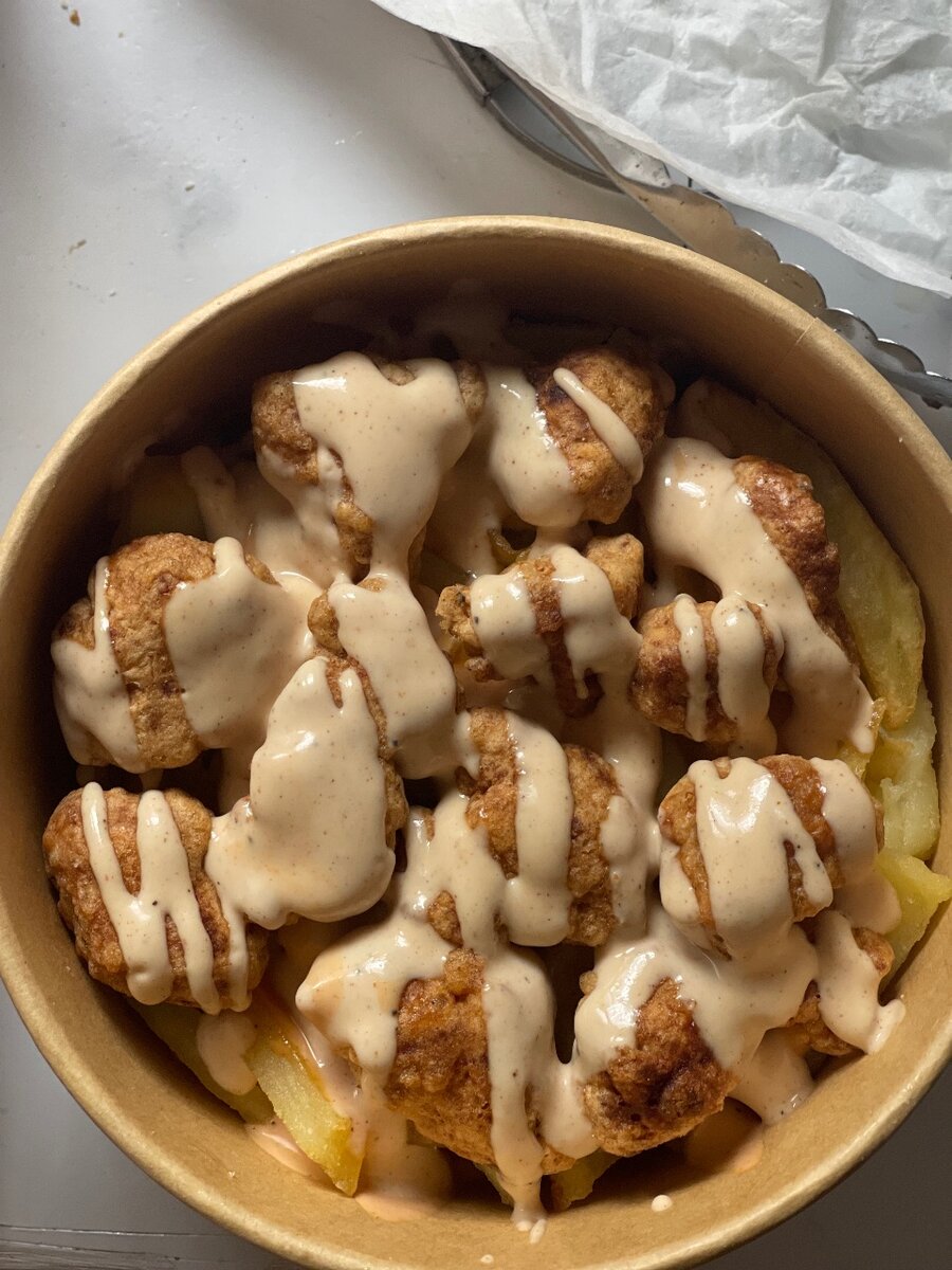 Savourez cette délicieuse poutine garnie de morceaux croustillants et d'une sauce onctueuse. Une harmonie parfaite entre croquant et crémeux, idéale pour un repas réconfortant. Parfait pour les amateurs de cuisine moderne cherchant à redécouvrir un classique avec une touche innovante.
