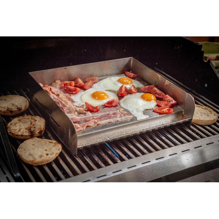 32cm x 28cm la plancha Grill en acier inoxydable. Parfaite pour les grillades, oeufs, pancakes, crêpes, le riz cantonais... à cuisiner sur la cuisinière à gaz ou le barbecue. Notre plancha est livrée avec une magnifique Spatule BBQ en inox.