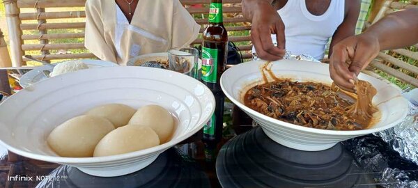 Dégustez ce délicieux plat africain avec poisson grillé, sauce épicée et légumes frais. Parfait pour un repas exotique rempli de saveurs authentiques. Idéal pour les amateurs de cuisine africaine, ce plat offre un mélange unique de goûts et de textures.