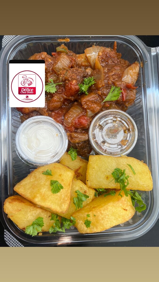 Découvrez ce délicieux repas de viande épicée accompagné de pommes de terre croustillantes. Parfait pour une pause déjeuner savoureuse ou un dîner copieux. Profitez d'une explosion de saveurs avec chaque bouchée.