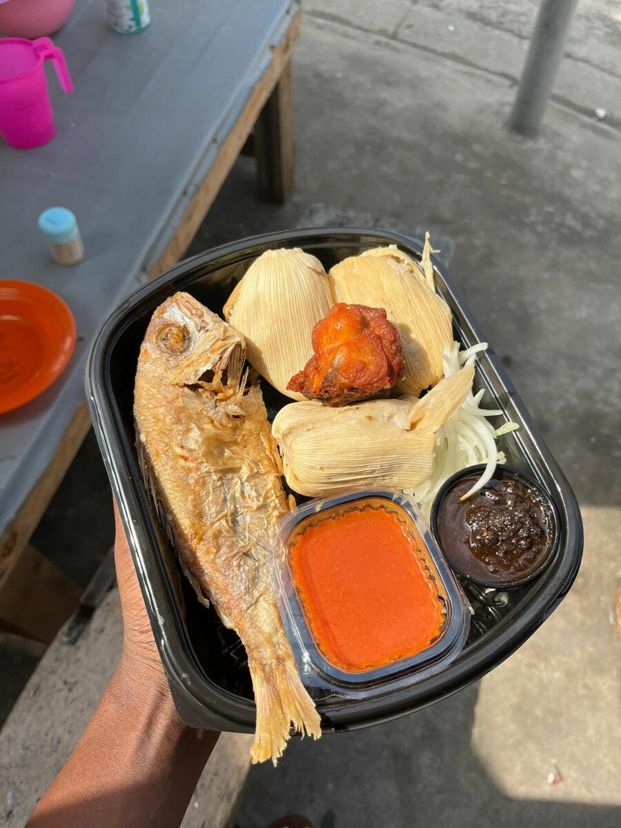 Savourez ce mélange de poissons grillés, de tamales moelleux et de sauces épicées, parfait pour un repas rapide et satisfaisant.
