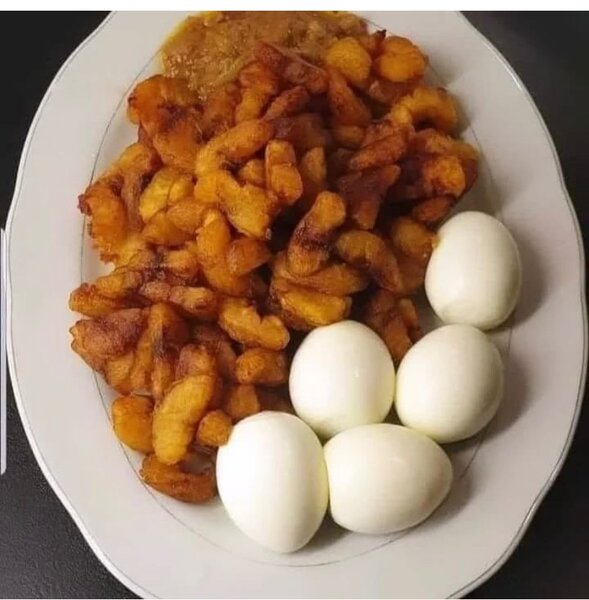 Savourez ce délicieux plat de bananes frites accompagnées d'œufs durs et d'une sauce épicée.