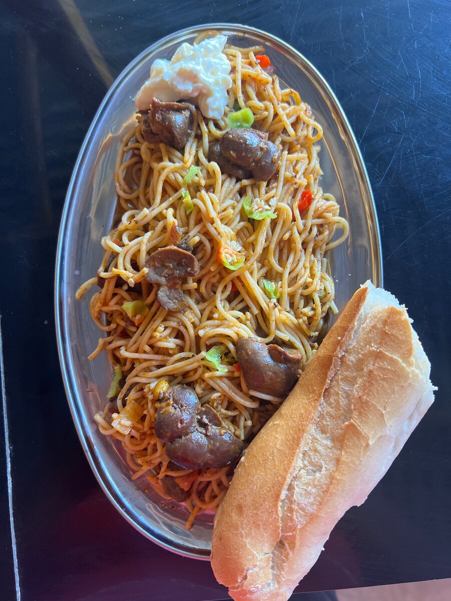 Savourez notre délicieux plat de nouilles accompagné de morceaux de viande savoureux et d'un pain croustillant. Parfait pour un repas copieux et satisfaisant. Idéal pour les amateurs de cuisine réconfortante!