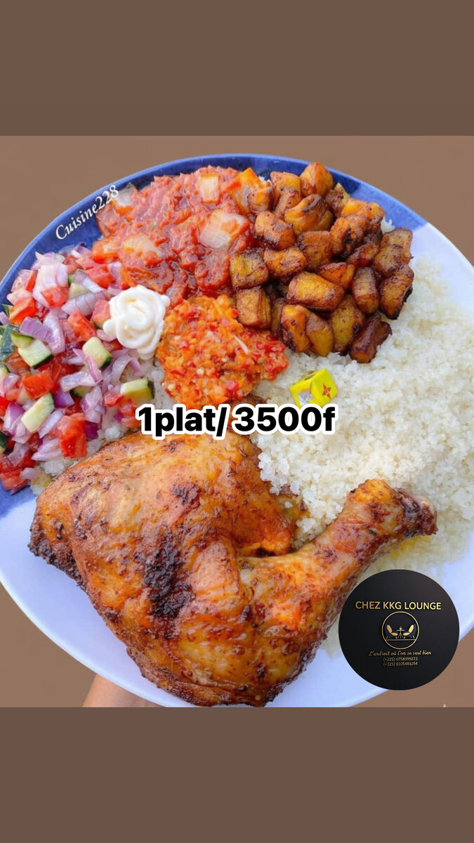 Savourez un délicieux plat de poulet grillé accompagné de riz, bananes plantains et une salade fraîche. Idéal pour un repas copieux et savoureux. Parfait pour toutes les occasions gourmandes.