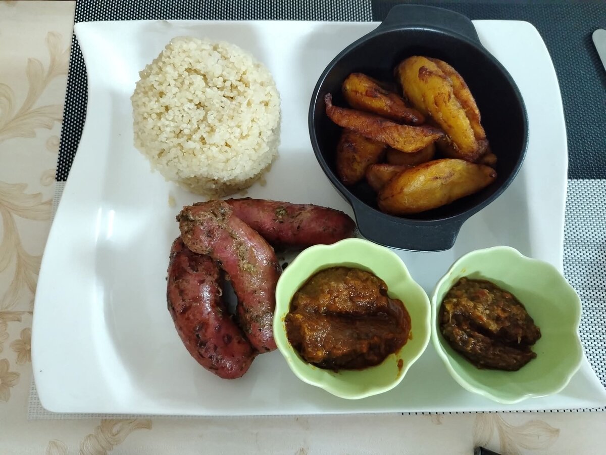 Découvrez notre délicieux plat africain composé de riz, d'ignames épicées et de plantains frits, accompagné de sauces exquises pour une expérience culinaire authentique. Parfait pour un repas exotique et riche en saveurs.
