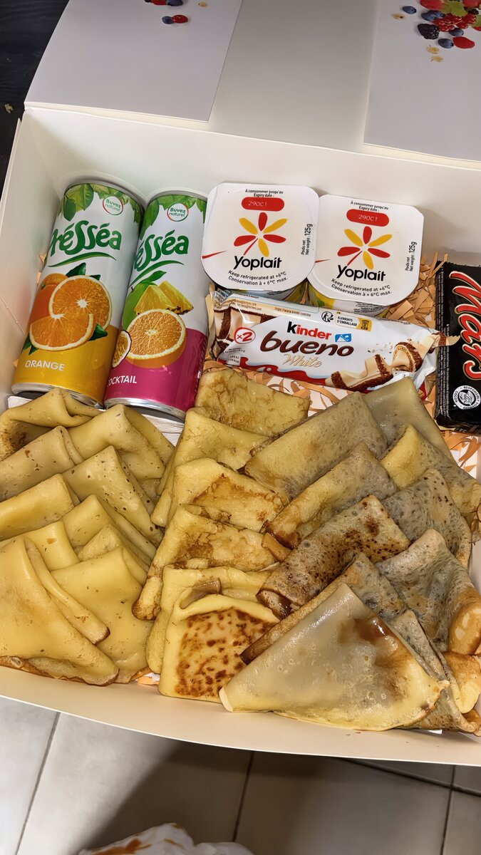Savourez un délicieux plateau petit-déjeuner comprenant des crêpes moelleuses, des yaourts Yoplait fruités et des surprises chocolatées Kinder Bueno et Twix. Accompagné de jus rafraîchissants Pressade. Parfait pour commencer la journée avec énergie et plaisir.