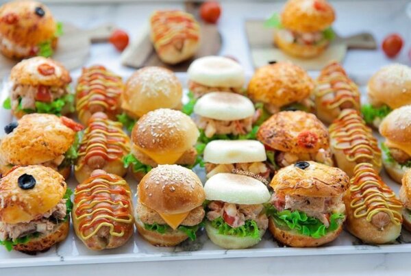 Pizza,mini buger,quiches,cakes