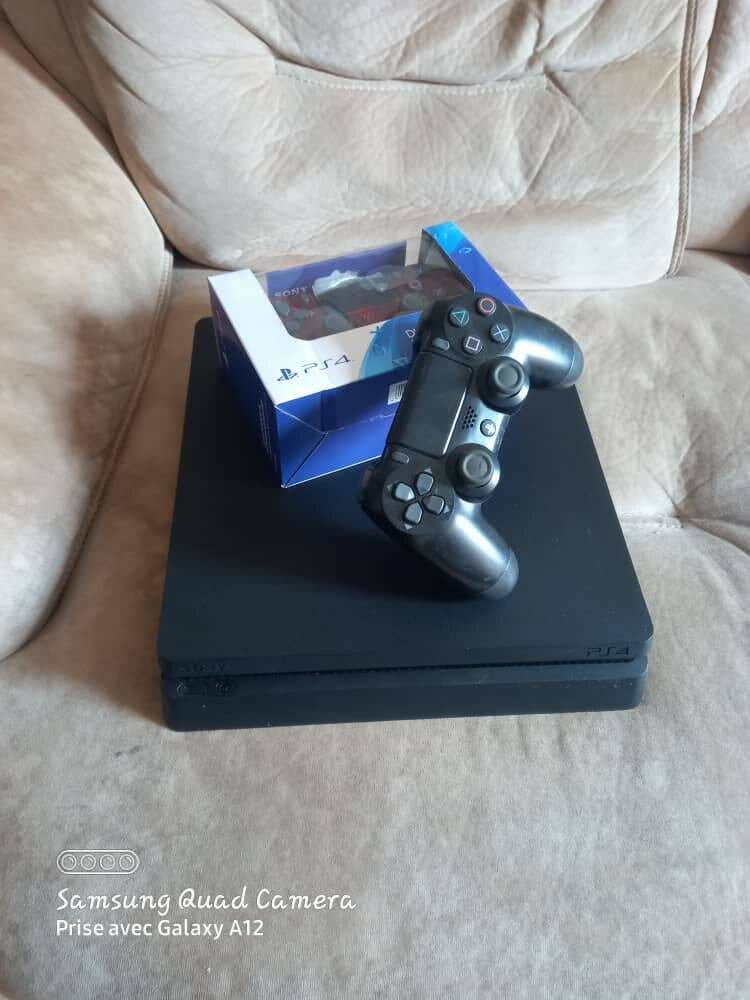 Console de jeu PlayStation 4 Slim avec manette et accessoires. État impeccable, prêt à l'emploi. Idéal pour les amateurs de jeux vidéo.
