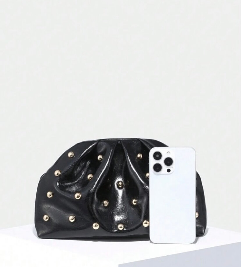Découvrez notre pochette élégante, ornée de clous dorés pour un look chic et moderne. Parfaite pour une soirée ou un événement spécial, elle est suffisamment spacieuse pour vos essentiels comme le téléphone ou le maquillage. Disponible en noir et rouge, c'est un accessoire incontournable pour toute occasion.