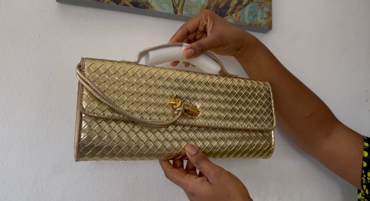 Découvrez notre pochette en cuir tressé, parfaite pour une soirée élégante. Elle allie style et fonctionnalité avec sa fermeture sécurisée et sa poignée raffinée. Disponible en or et bleu marine, elle s'adapte à toutes vos tenues. Idéale pour les événements spéciaux ou un cadeau chic.