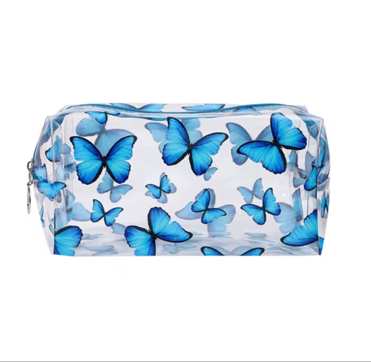 Élégante pochette de maquillage transparente ornée de papillons bleus. Idéale pour ranger cosmétiques ou objets personnels en voyage. Design unique et pratique, parfait pour toutes les occasions.