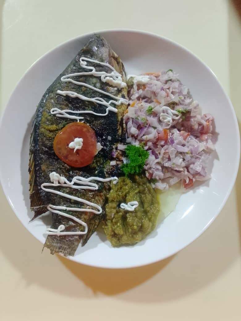 Savourez ce délicieux poisson grillé, accompagné d'un mélange de légumes frais et d'une sauce épicée. Parfait pour un dîner sain et gourmand!