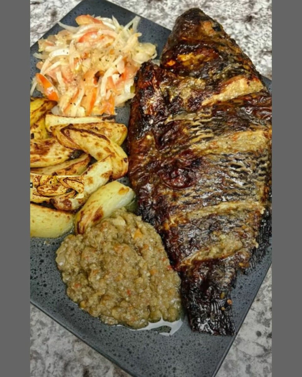 Poisson Carpe Braisé assaisonné Aux épices Du Cameroun + Frites De Pomme De Terre. LES PLATS SONT DISPONIBLES JUSQU'À 21HEURES