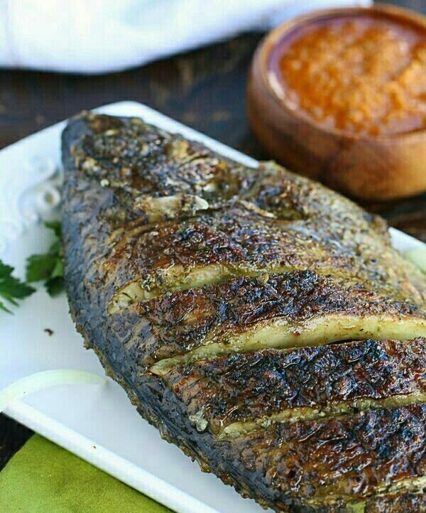 Poisson Carpe Braisé assaisonné Aux épices Du Cameroun + Attiéké LES PLATS SONT DISPONIBLES JUSQU'À 21HEURES