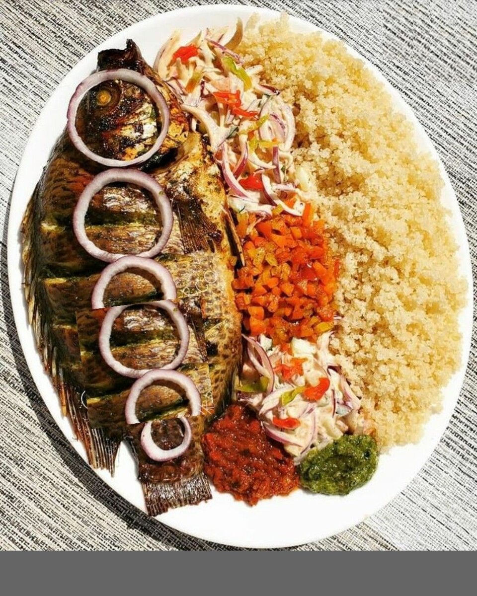 Poisson Carpe Braisé assaisonné Aux épices Du Cameroun + Attiéké. LES PLATS SONT DISPONIBLES JUSQU'À 21HEURES