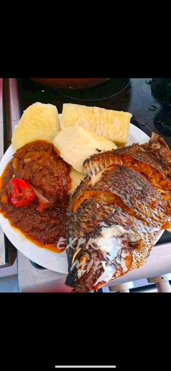 Découvrez notre délicieux plat de poisson frit servi avec du Fufu et une sauce piquante. Idéal pour les amateurs de cuisine africaine.