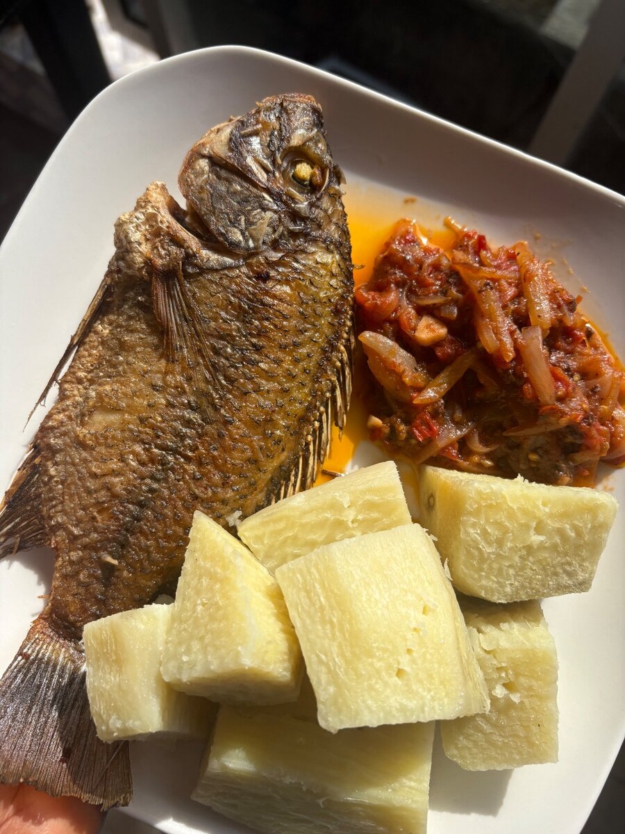 Savourez un délicieux poisson grillé accompagné d'igname bouillie et d'un accompagnement savoureux. Idéal pour une expérience culinaire exotique.