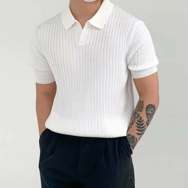 Élégant polo en maille côtelée blanc pour hommes, parfait pour un look décontracté et chic. Confortable et respirant, idéal pour les journées chaudes. S'accorde parfaitement avec des jeans ou des pantalons habillés. Un choix polyvalent pour des occasions variées.